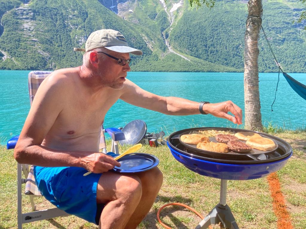 Eerst maar eens een wasje gedraaid omdat het misschien de laatste dag mooi weer is en hier was de mogelijkheid er. Jaco heeft nog een poging gewaagd om te zwemmen maar het water was wel erg koud. Hamburger met uitjes op de skottelbraai gebakken als lunch.