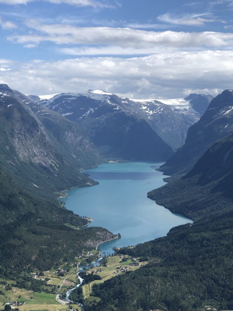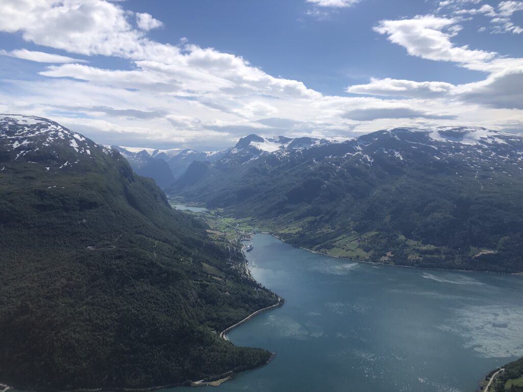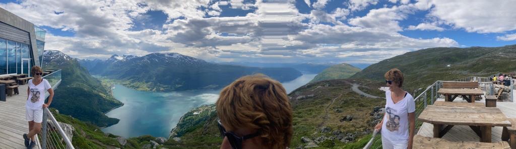 Na de was, het aperitief en de lunch op de fiets naar Loen, ongeveer 9 km. Af en toe een beetje klimmen en dalen, goed te doen voor deze twee ‘die hards’ 😉. Het was wel erg warm 28 graden. In Loen was niets te doen, alleen een kabelbaan, maar wel een hele hoge. De kabelbaan klimt met 7 meter per seconde binnen vijf minuten naar een hoogte van 1011 meter. Met een hellingsgraad tot wel 60 graden is dit de steilste kabelbaan ter wereld. De gondel hangt op het hoogste punt 170 meter boven de grond, dus moet je geen hoogtevrees hebben. Doen we het of doen we het niet, was de vraag, want hij was vrij prijzig. Maar ja, we komen hier waarschijnlijk nooit meer, dus gewoon doen. Onze ‘daktentvriend’ had het gisteren gedaan en zei dat je de prijs snel vergeten bent als je boven staat. En dat was ook zo. Alsof je op het dak van Noorwegen staat. Zicht op de gletsjer (wat er nog van over is), op Nordfjord met een cruiseschip, op het Lovatnet meer, op de bergen, een panorama van 180 graden. Ook terug zijn we met de lift gegaan want onze kuiten hadden nog geen zin om extra in te spannen.