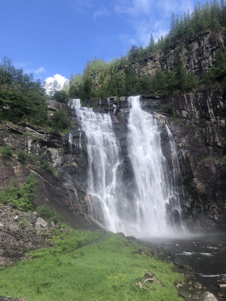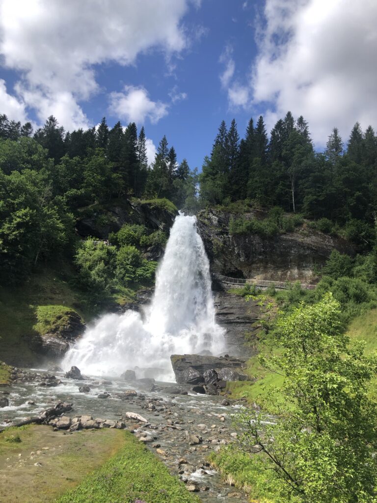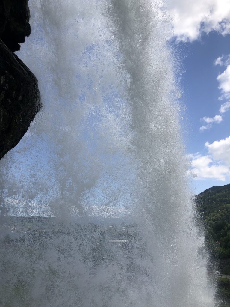 Na het toiletbezoek, inclusief foto’s🤣, doorgereden naar de volgende kletterende watermassa, de Steindalsfossen. Wat een geweld. De waterval is 50 meter hoog en is een populaire toeristenbestemming. Het is namelijk mogelijk om onder de waterval door te lopen zonder nat te worden. Voor de eerste keer in Noorwegen vonden wij het druk.
