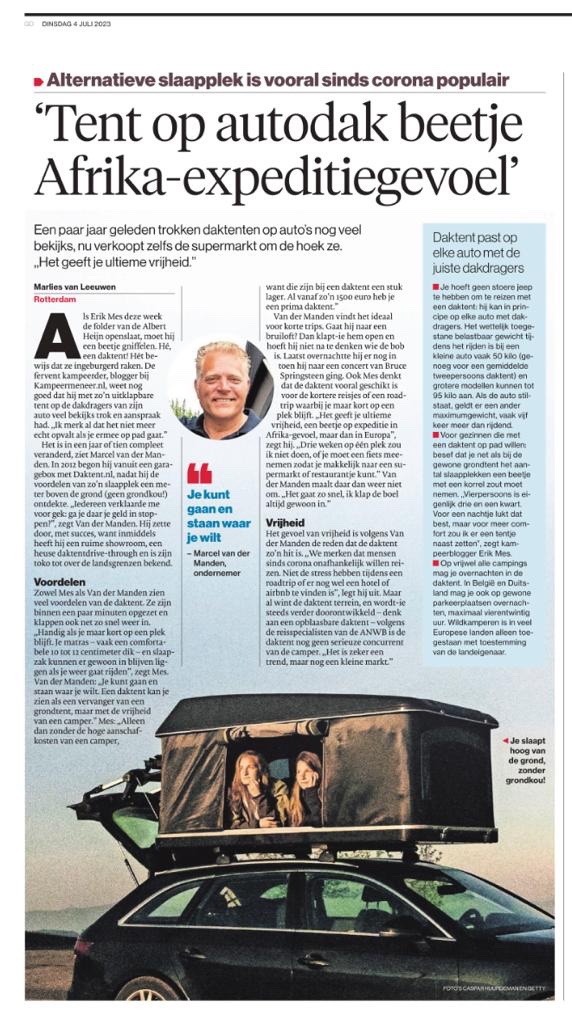 Haha vandaag stond onderstaand artikel in de krant. Er staat dat een daktent al gewoner wordt maar wij merken dat we nog vaak aangesproken worden. Wij hebben de luxe dat we een ondertent hebben. Gisteren op zo’n regenachtige dag zitten we dan lekker droog.