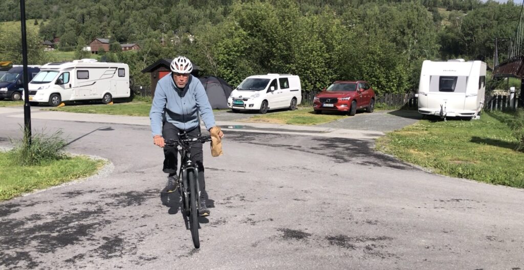 Onderweg in Øvre Ardal gestopt bij een bakker, Janet ging voor zoet en Jaco een hartige wrap. Het stadje was mooi gelegen aan het Ardalsvatnet. Het waren flink veel scherpe bochtjes en smalle weggetjes om er te komen en ook weer om er te vertrekken aan de andere zijde van de stad.