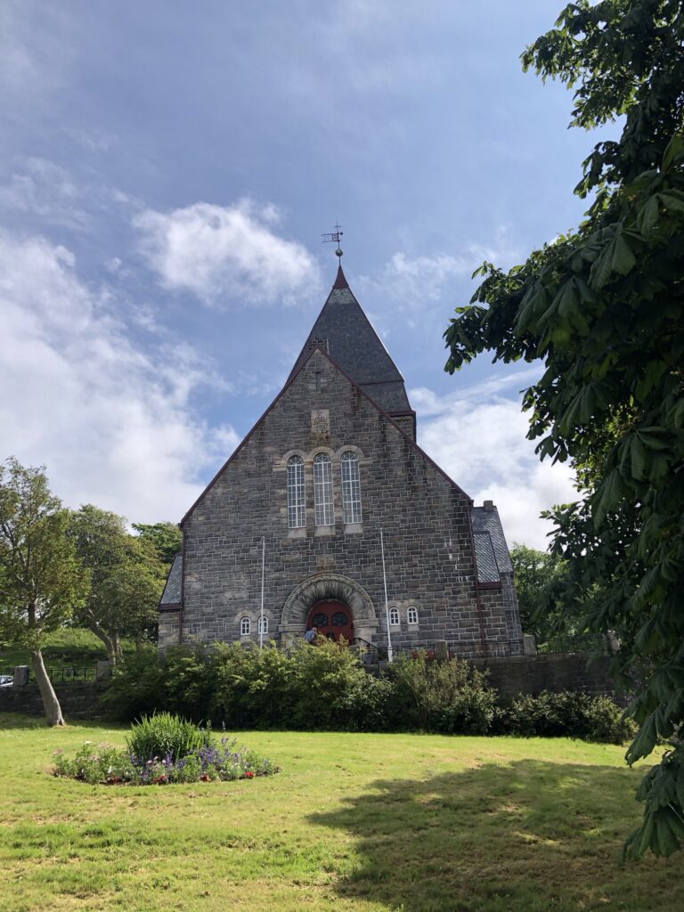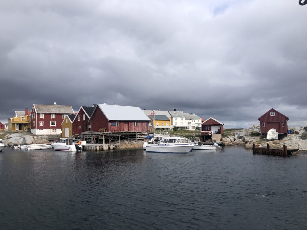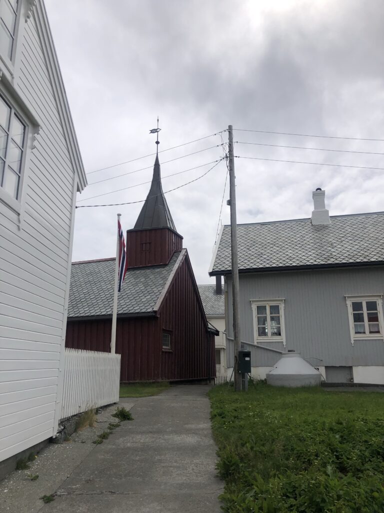 We kregen daar een rondleiding van de kapitein. In het één na kleinste kerkje in Noorwegen geweest, een staafkerkje uit 1470, later wel gerestaureerd. Het schip is maar 12 meter lang. Het altaar is ooit gedoneerd door een Nederlandse prinses (Elisabeth) omdat ze gered is op de Noorse zee tijdens een storm in 1515. Het is gemaakt in Utrecht dus een beetje van ‘ons’.